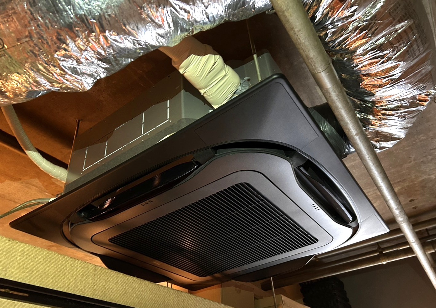 天井カセット形4方向 ダイキン製SZRC112BYにて施工させて頂きました。